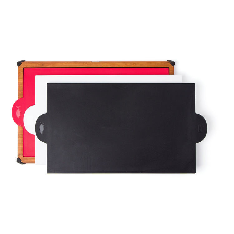 3 coloured vinyl cutting boards used to cut meat, fish and veg or bread. fitting beautifully into a bamboo case